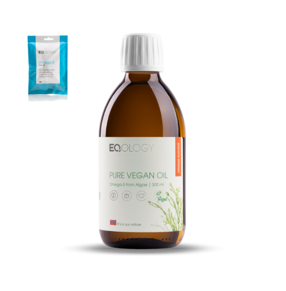 Czysty olej omega-3 ze 100% wegańskich, zrównoważonych i świeżych mikroalg z gatunku Schizochytrium z tłoczoną na zimno, wysokiej jakości organiczną oliwą z oliwek, z dodatkiem naturalnego aromatu pomarańczowego i następującej kombinacji przeciwutleniaczy: niezbędnego ekstraktu z rozmarynu, witamina E i witamina D3.